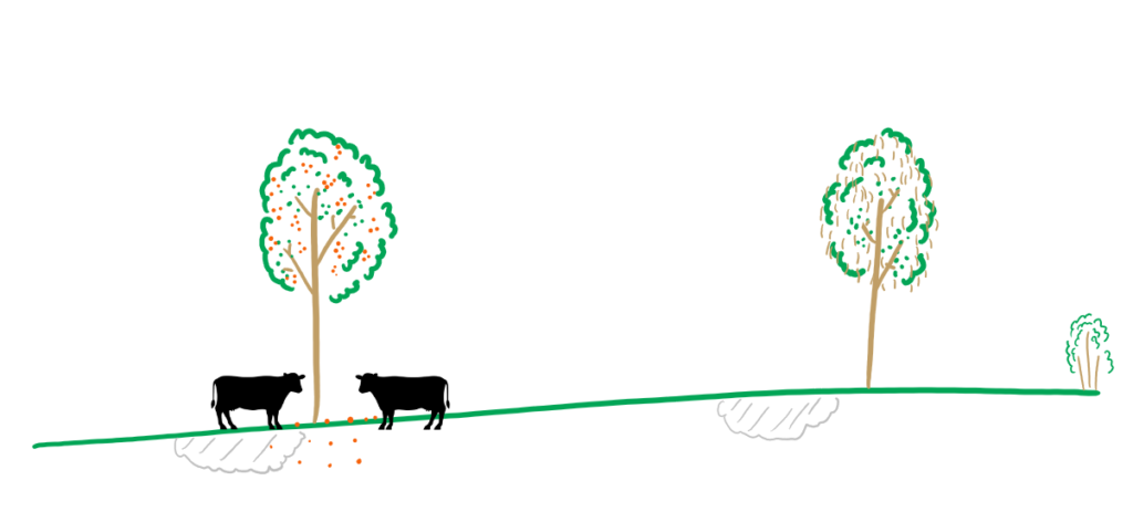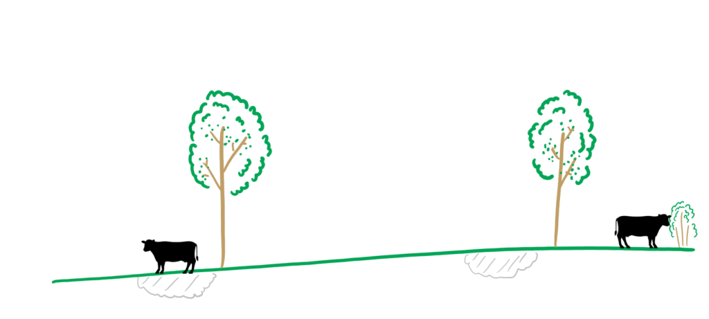 Summer: Summer is when the benefits of trees on livestock health come into focus, as they reduce the heat stress on livestock, thus keeping their production up. As numerous studies have shown, heat stress leads to reduced weight gain, lower rates of fertility and decreased milk production (Florida beef production; Heat stress and fertility; effect on milk production). By thoughtfully designing and managing a silvopasture, we can extend the active growing period of cool-season forages further into the summer, as trees reduce soil temperatures both through intercepting a portion of sunlight and through the cooling effect of evaporation.