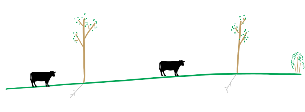 Let me be the first to recognize that there’s a real scarcity of documented examples of a full system like this in practice. The ingredients that make up this system are all certainly out there. Much of the best documentation from a grazier comes from Greg Judy, who shows how grass stays green and palatable longer in the shade of a honey locust (video), how even autumn olives can restore soil and offer valuable fodder (article and video) and how much cattle just plain love the shade (video). Virginia Tech has been doing research on silvopasture systems for years, and has likely the best example of well-spaced, high-yielding honey locust groves in the country (video).