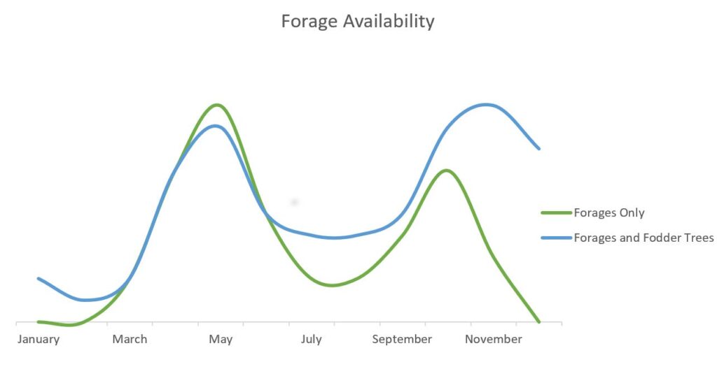 There’s good reason to love the changing seasons. The rollercoaster ride that is forage production is not one of those reasons. The summer slump and a long winter without forage growth both require a lot of creativity and expense in order to keep livestock fed. My goal, as someone who is not a grazier, but rather a tree-person learning as much about grazing as possible, is to determine how and where trees can best compliment a grazing operation. What emerges is a picture of how the right trees, used strategically, can reduce the extremes of hot and cold, feast and famine, resulting in more moderate conditions throughout the year, and more feed during the summer and winter.